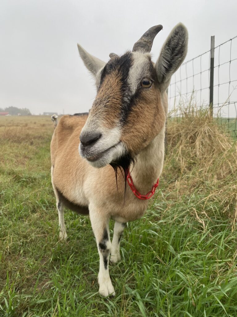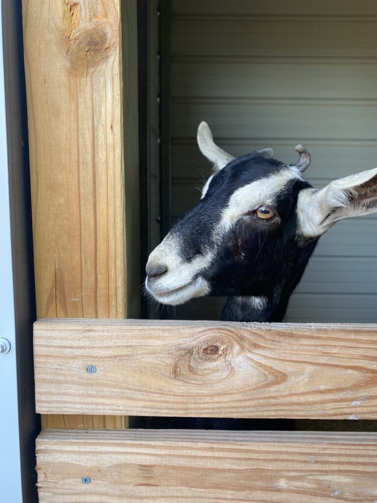 Our sweet Bird is the oldest gal in our mini herd, but she certainly doesn’t act like it! Although she retired from dairy life this year, queen Birdie enjoys all the luxuries of dairy goat life – unlimited grazing on our 16 acres of pasture and alfalfa galore. Birdie gave us a small batch of milk after her last kidding in the spring of 2025, which we used to make a special set of goat milk soaps for our first ever market in fall of this year. They were divine!